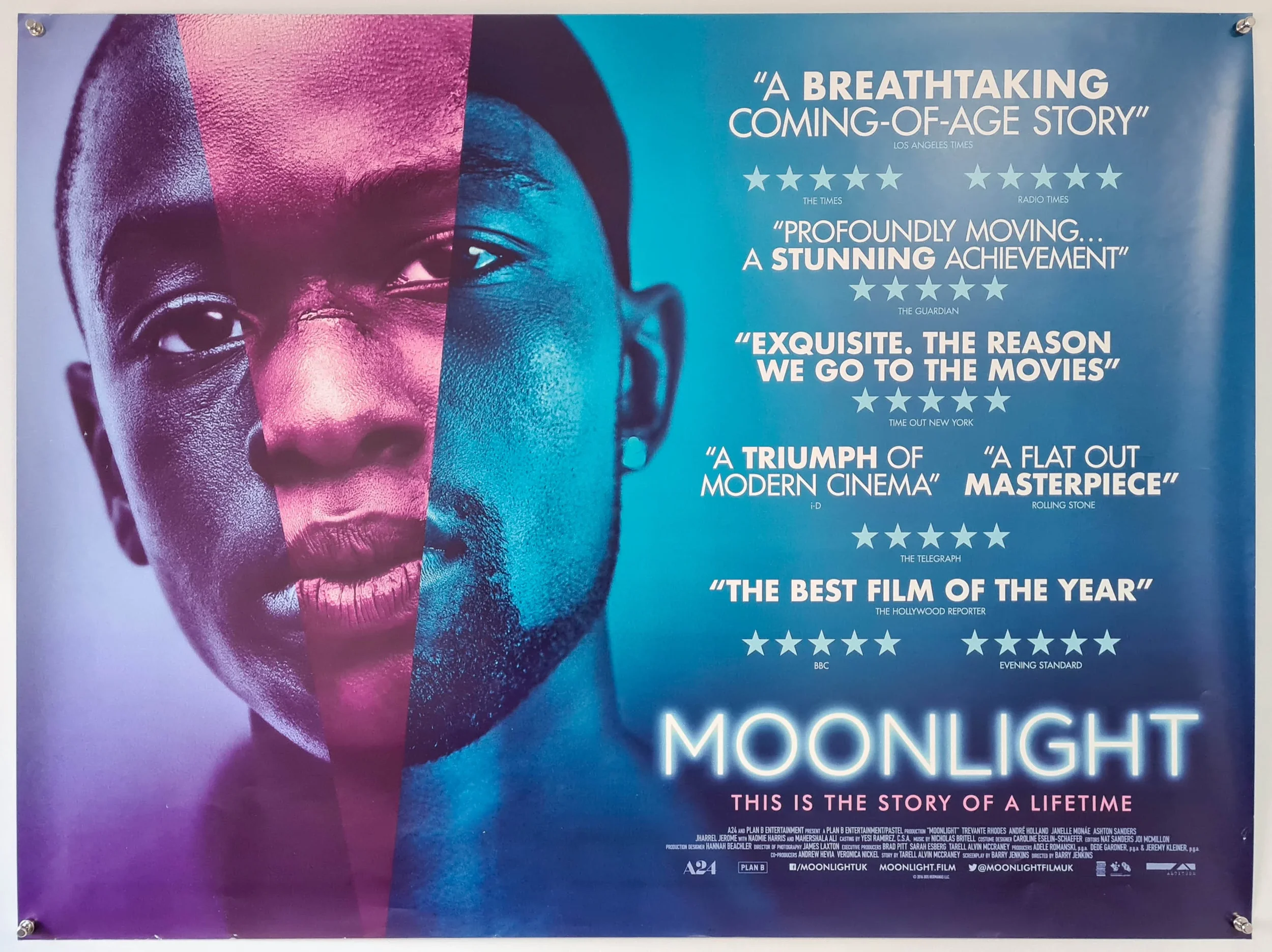 Moonlight (2016) took a different approach with its triptych poster showing Chiron at three stages of life, bathed in the film's signature blue tones. The design choice mirrors the film's three act structure and immediately communicates that this is a story about identity, transformation, and time. It's beautiful, yet informative enough to give potential viewers a genuine sense of what they're about to experience.